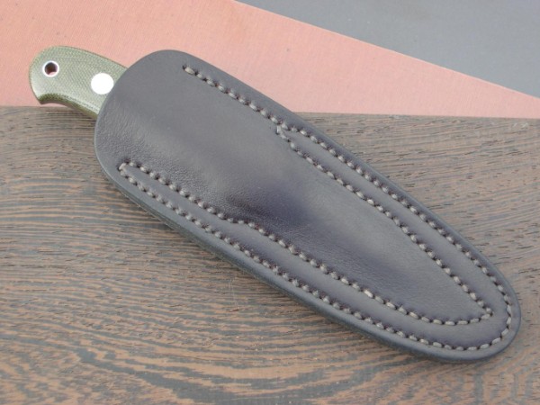 La siguiente pieza está realizada en acero Böhler N690 de 5,3 mm de grosor, empuñadura con cachas de micarta Loveless verde, separadores rojos y bolsters y tornillos de acero inoxidable. La funda a medida cosida y encerada a mano: